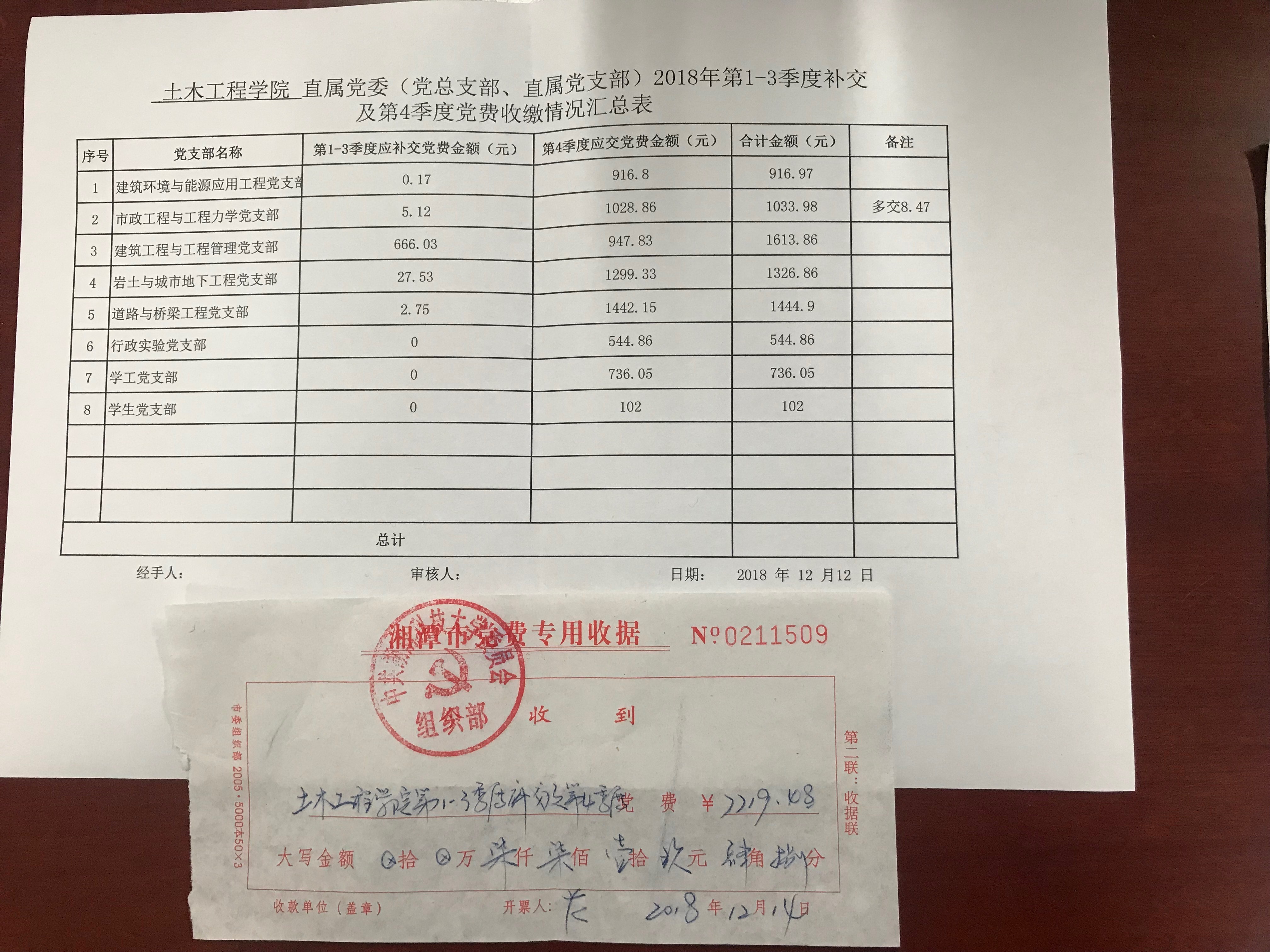 党建工作 党建工作 首页 / 党建人事 / 党建工作 / 公告栏 公告栏 土木学院2018年第1-3季度补交及第四季度党费收缴情况汇总表 发布时间:2018年12月14日 编辑: 访问量: 36365线路检测登录入口
