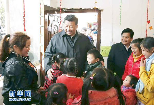 2015年元月,云南鲁甸地震灾区甘家寨受灾群众异地过渡安置点,前来考察的习近平总书记走到孩子们中间,牵着孩子们的手,驻足观看他们的蜡笔画,祝他们健康成长。