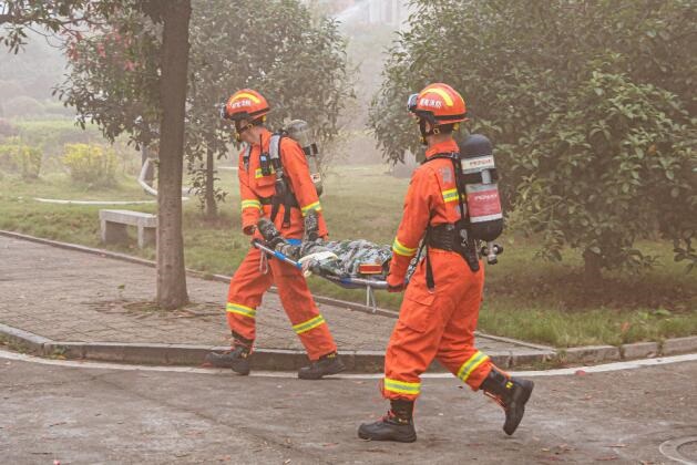随后,应急疏散演练正式开始,此次演练模拟了外国语学院失火,人员被困,现场采用烟雾发生器来模拟火灾发生时产生的滚滚浓烟。消防人员兵分三路,一队在做好防护措施后立即冲进火场,搜救被困人员。同时,在外的小队负责灭火,他们迅速接好设备,用水扑灭火源,稀释浓烟。另一队运用消防云梯车,消防梯等设备,将高楼层被困人员成功转移到地面。经过短暂地搜寻,进入建筑搜救地小队找到了被困的同学,用担架将受伤人员救出。整个过程,消防人员动作迅捷快速,出色地完成了此次任务。