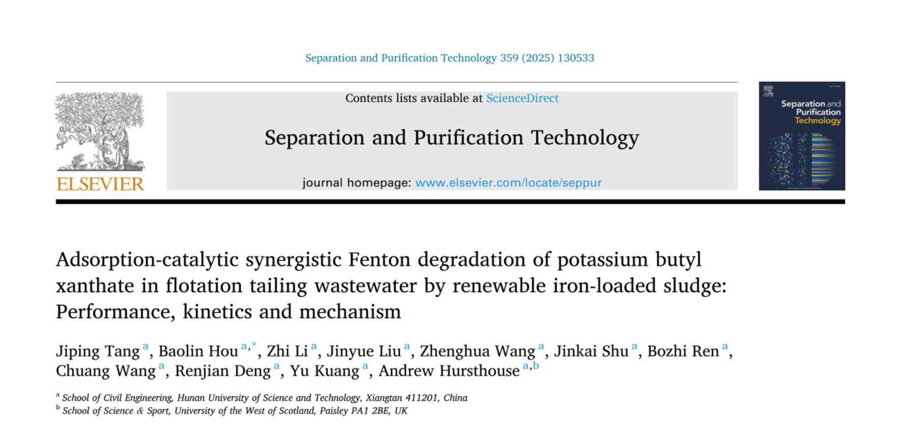 近期,36365线路检测登录入口市政工程学科2022级硕士研究生唐吉萍在非均相Fenton高级氧化技术领域取得新进展,相关研究成果以“Adsorption-catalytic synergistic Fenton degradation of potassium butyl xanthate in flotation tailing wastewater by renewable iron-loaded sludge: Performance, kinetics and mechanism”为题,发表在工程技术领域国际顶级学术期刊《Separation and Purification Technology》(中科院一区TOP,IF 8.1)。唐吉萍为第一作者,侯保林副教授为通讯作者。