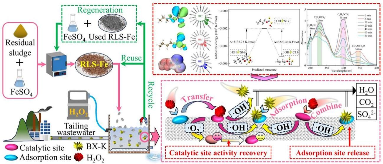 对于尾矿废水中残余捕收剂污染严重和剩余污泥处置困难问题,以典型捕收剂丁基黄原酸钾为目标污染物,基于非均相Fenton体系开发了具备吸附和催化功能的载铁污泥催化剂。研究全面评估了载铁污泥催化剂的吸附和催化效果,通过动力学模型明确了吸附和催化的协同作用。结合密度泛函理论计算,详细解析了丁基黄原酸钾的反应位点和降解过程。根据表征分析、自由基鉴别和理论计算结果,深入探讨了吸附和催化的协同机理。研究结论为吸附-催化双功能材料的研发、尾矿废水的高效治理以及污泥的资源化利用提供了参考,具有重要的科学价值与工程意义。