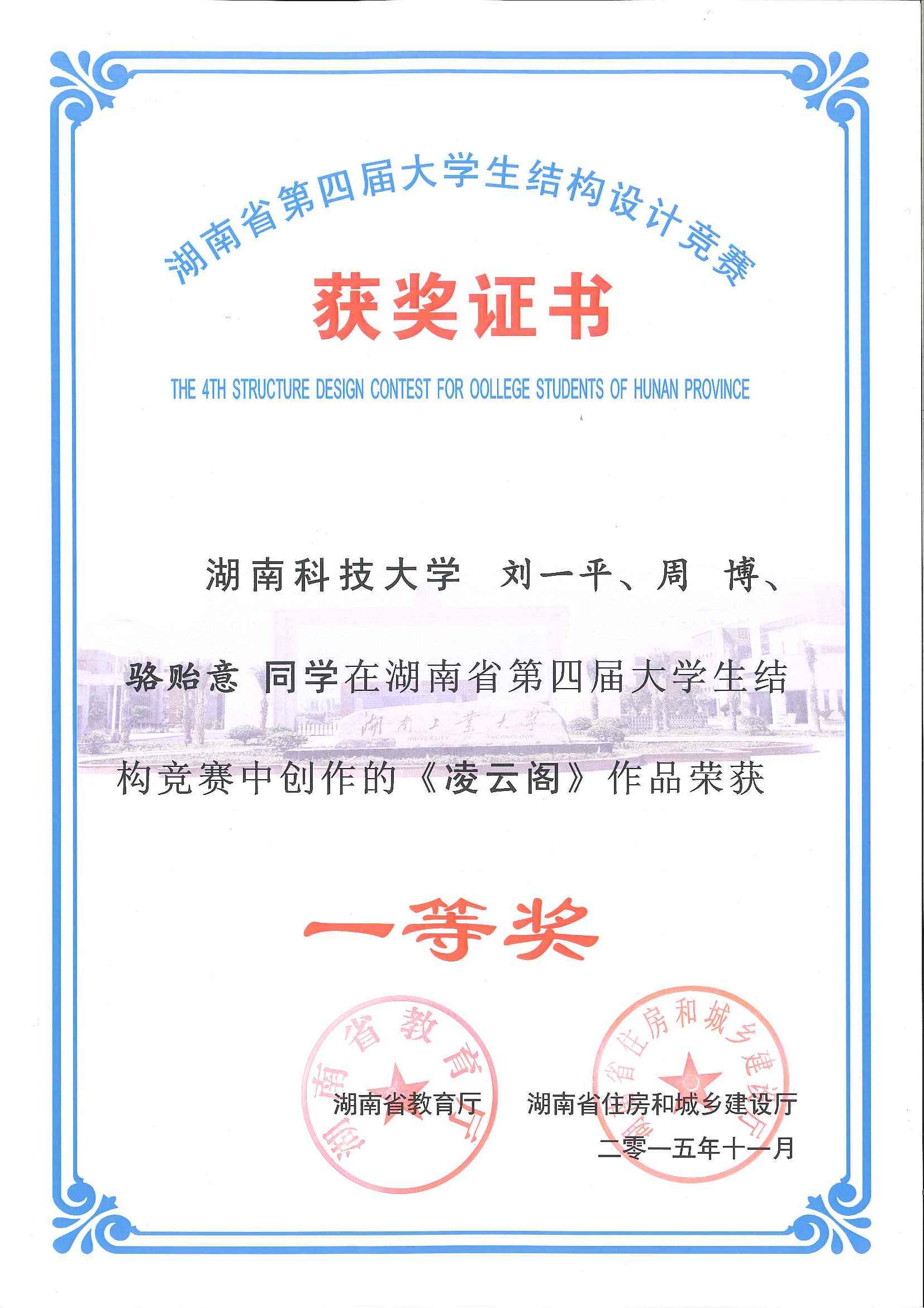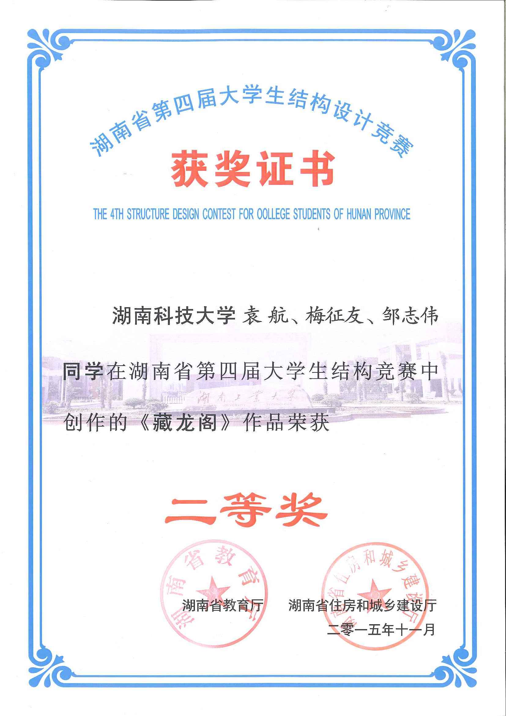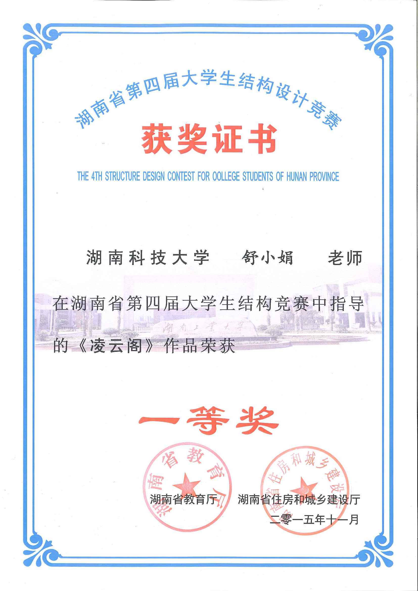 2015年11月27日至29日,湖南省第四届大学生结构设计竞赛在湖南工业大学成功举办。36365官网组织和选派了4支队伍参加了本次比赛,其中舒小娟老师指导的参赛队伍现场完成的名为“凌云阁”的模型获得了一等奖,由汪建群老师、禹见达老师、李永贵老师分别指导的三组学生也均荣获二等奖。本届竞赛再次展现了36365官网在湖南省大学生结构设计竞赛中处于领先的水平。