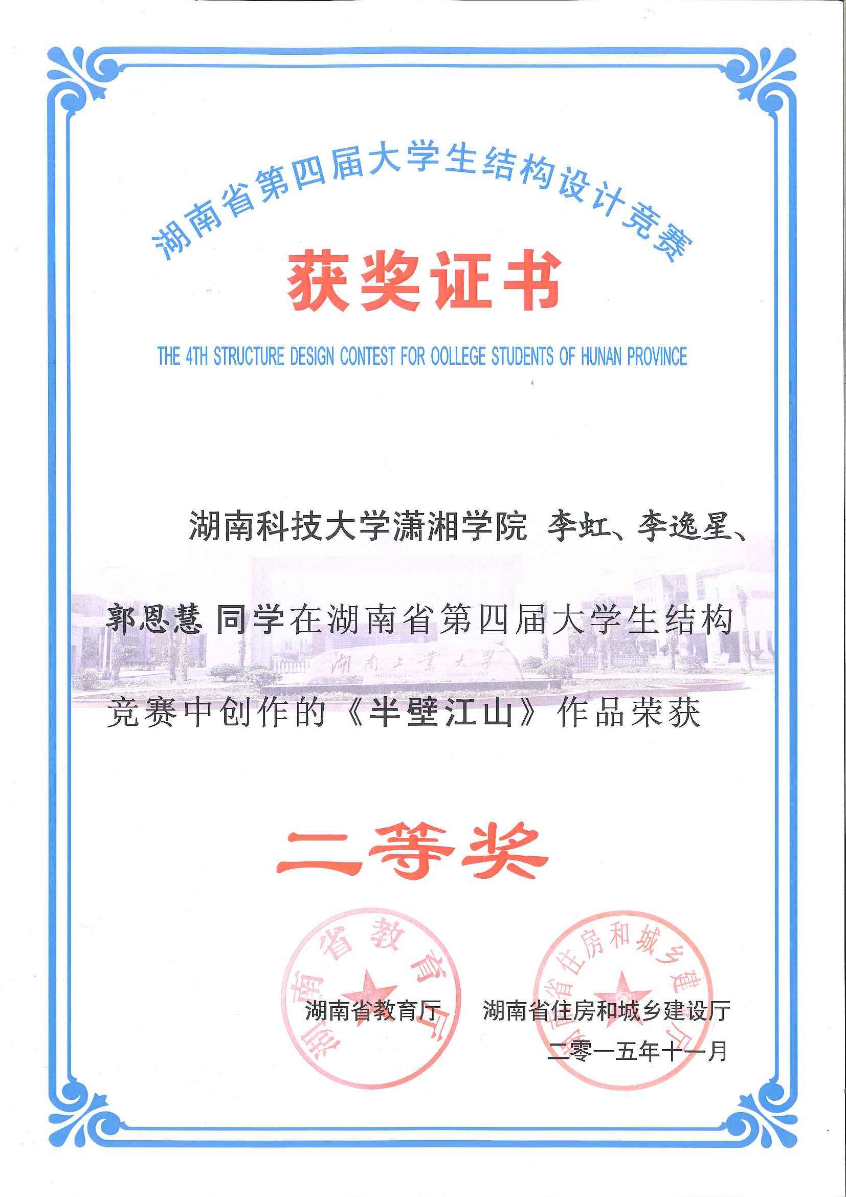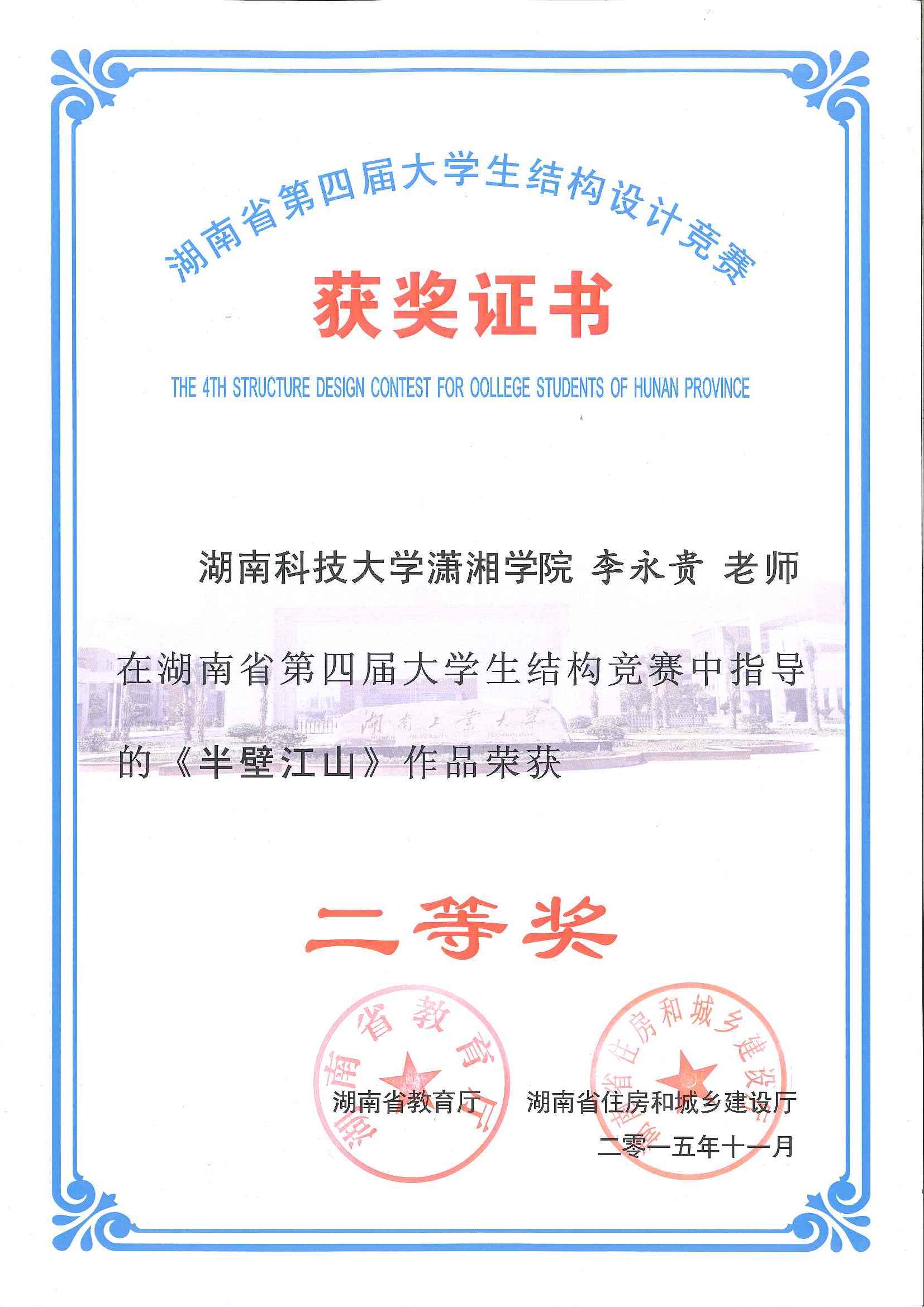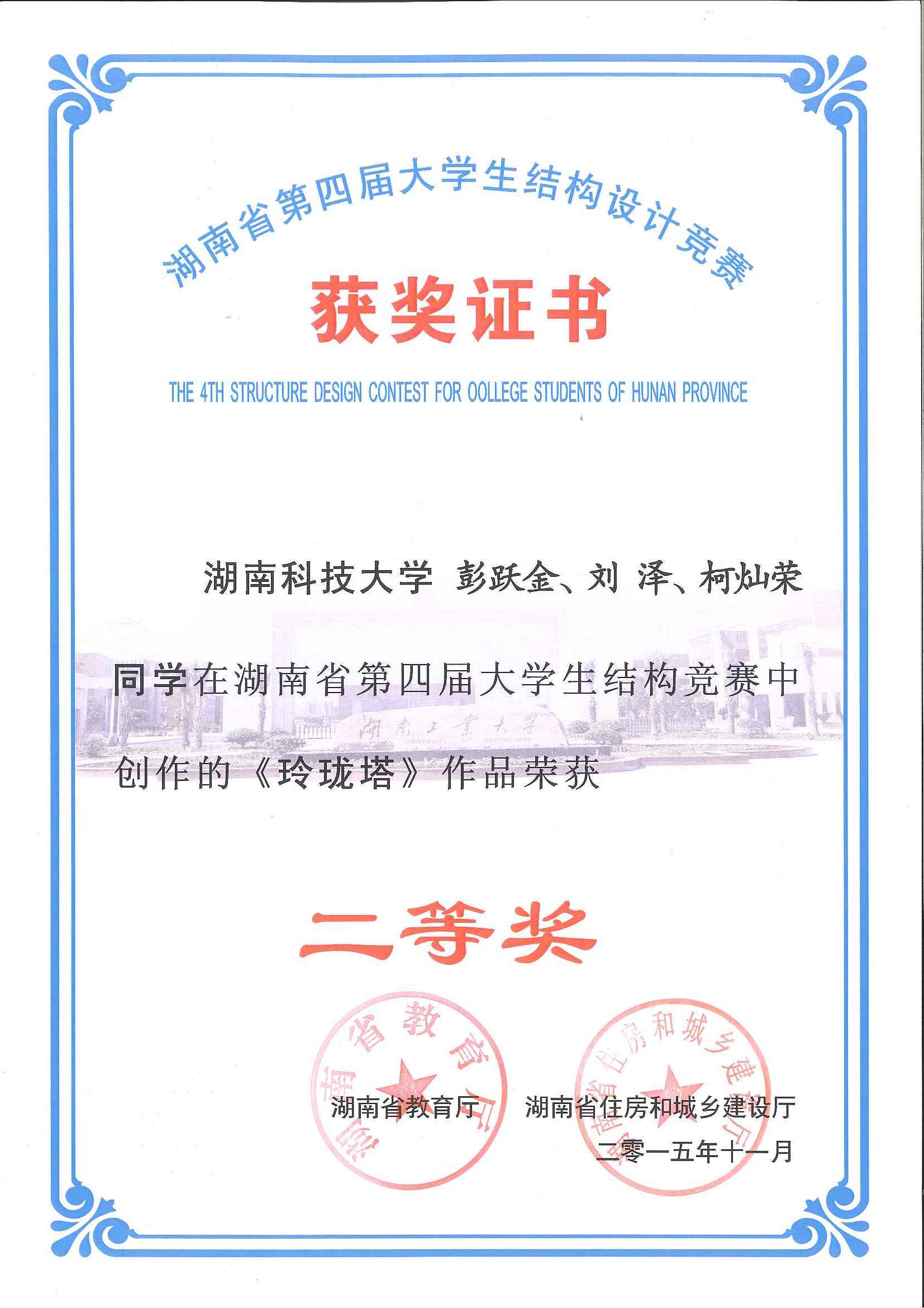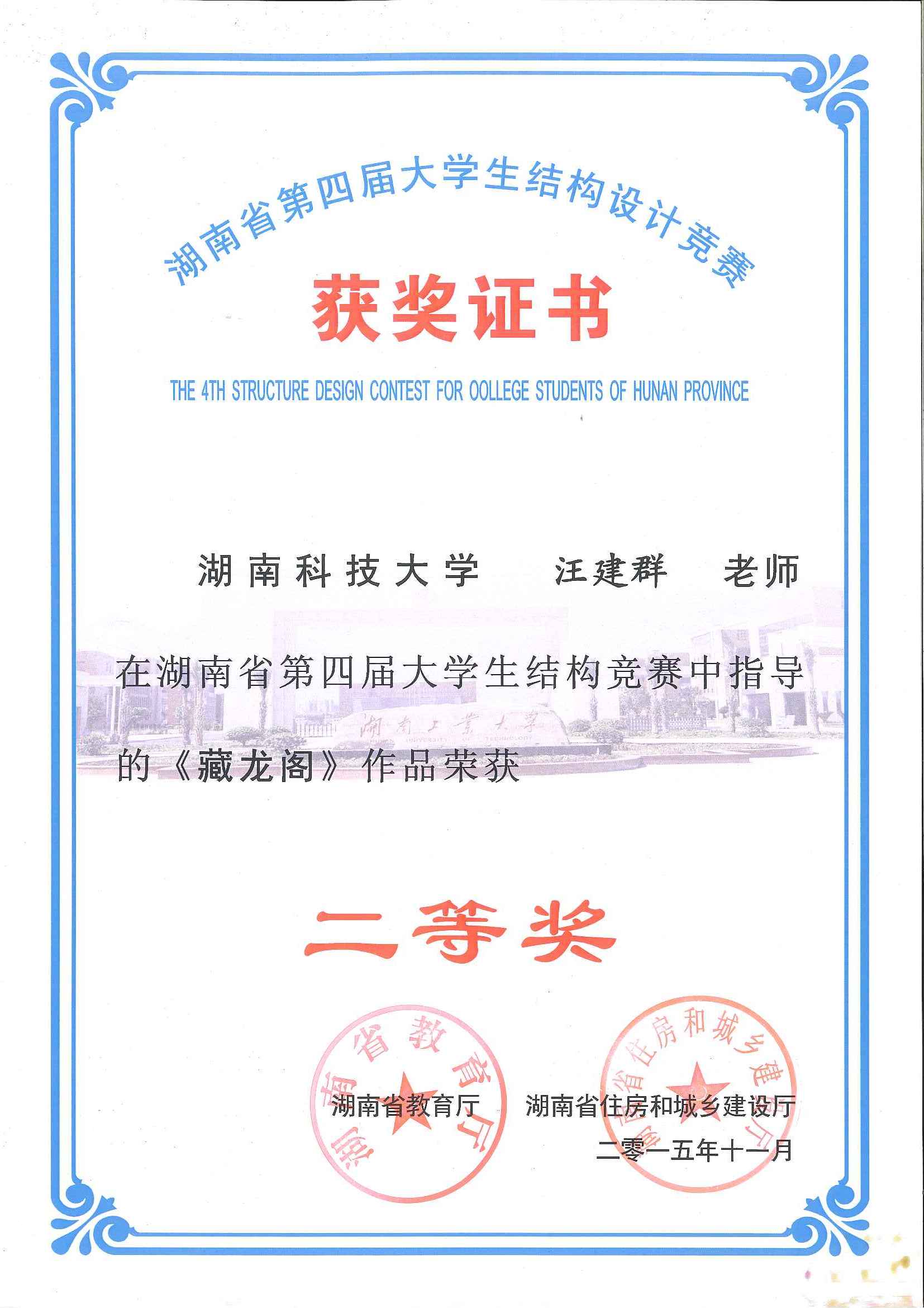 2015年11月27日至29日,湖南省第四届大学生结构设计竞赛在湖南工业大学成功举办。36365官网组织和选派了4支队伍参加了本次比赛,其中舒小娟老师指导的参赛队伍现场完成的名为“凌云阁”的模型获得了一等奖,由汪建群老师、禹见达老师、李永贵老师分别指导的三组学生也均荣获二等奖。本届竞赛再次展现了36365官网在湖南省大学生结构设计竞赛中处于领先的水平。