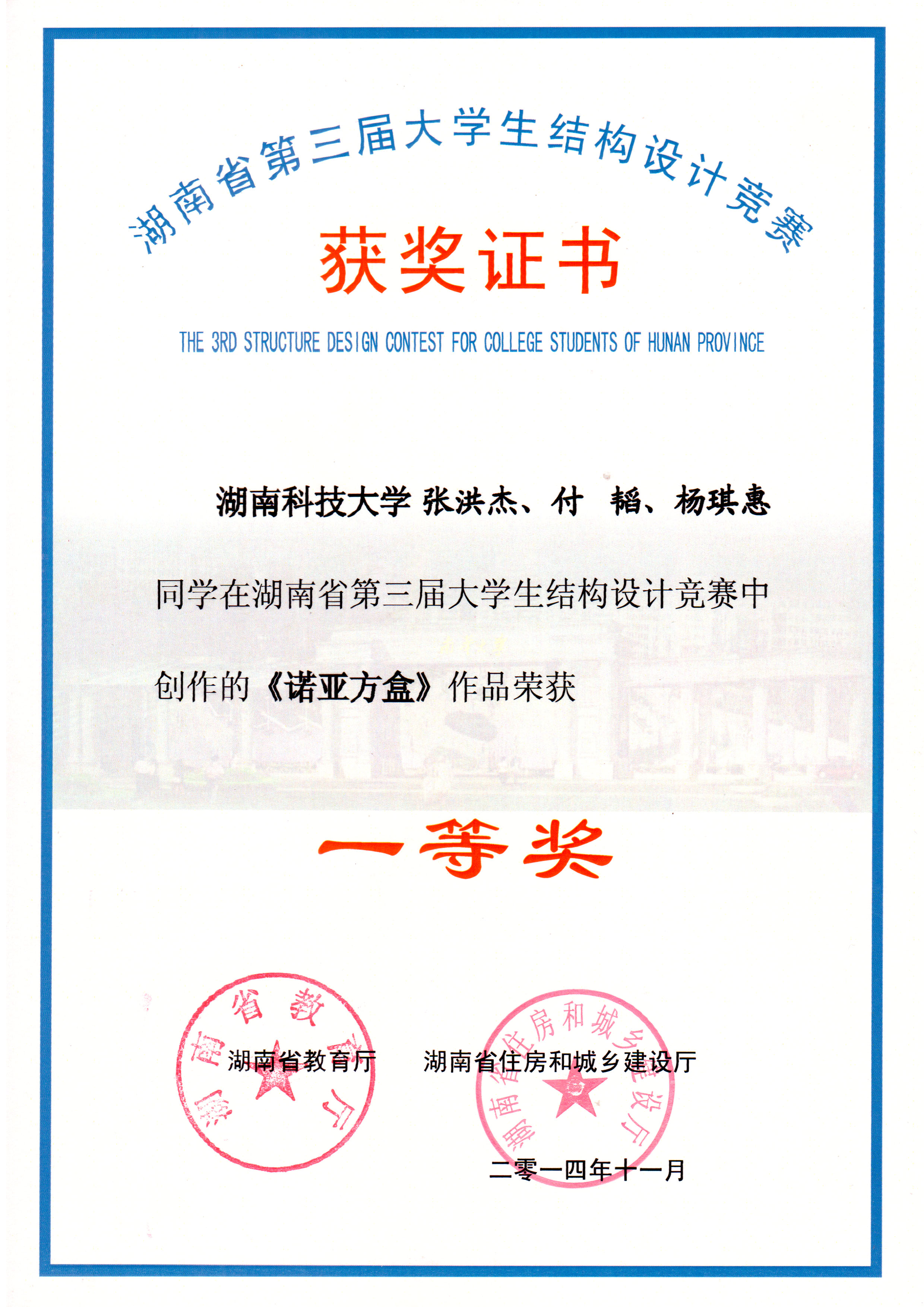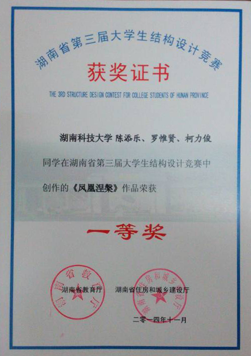 湖南省第三届大学生结构设计竞赛于2014年11月28日至30日在南华大学举行,本次竞赛共有28所普通高等学校的64支代表队参加。36365官网组织和选派了4支队伍参加了本次比赛,其中汪建群老师和舒小娟老师指导的学生团队分别以第一名和第二名的成绩斩获2项一等奖,同时取得一个参加全国总决赛的资格。本届竞赛标志着36365官网在大学生结构设计竞赛的指导上已步入一流水平。