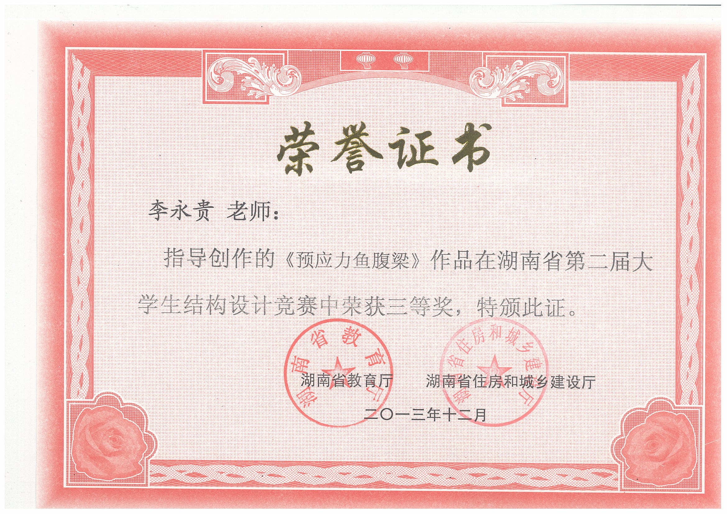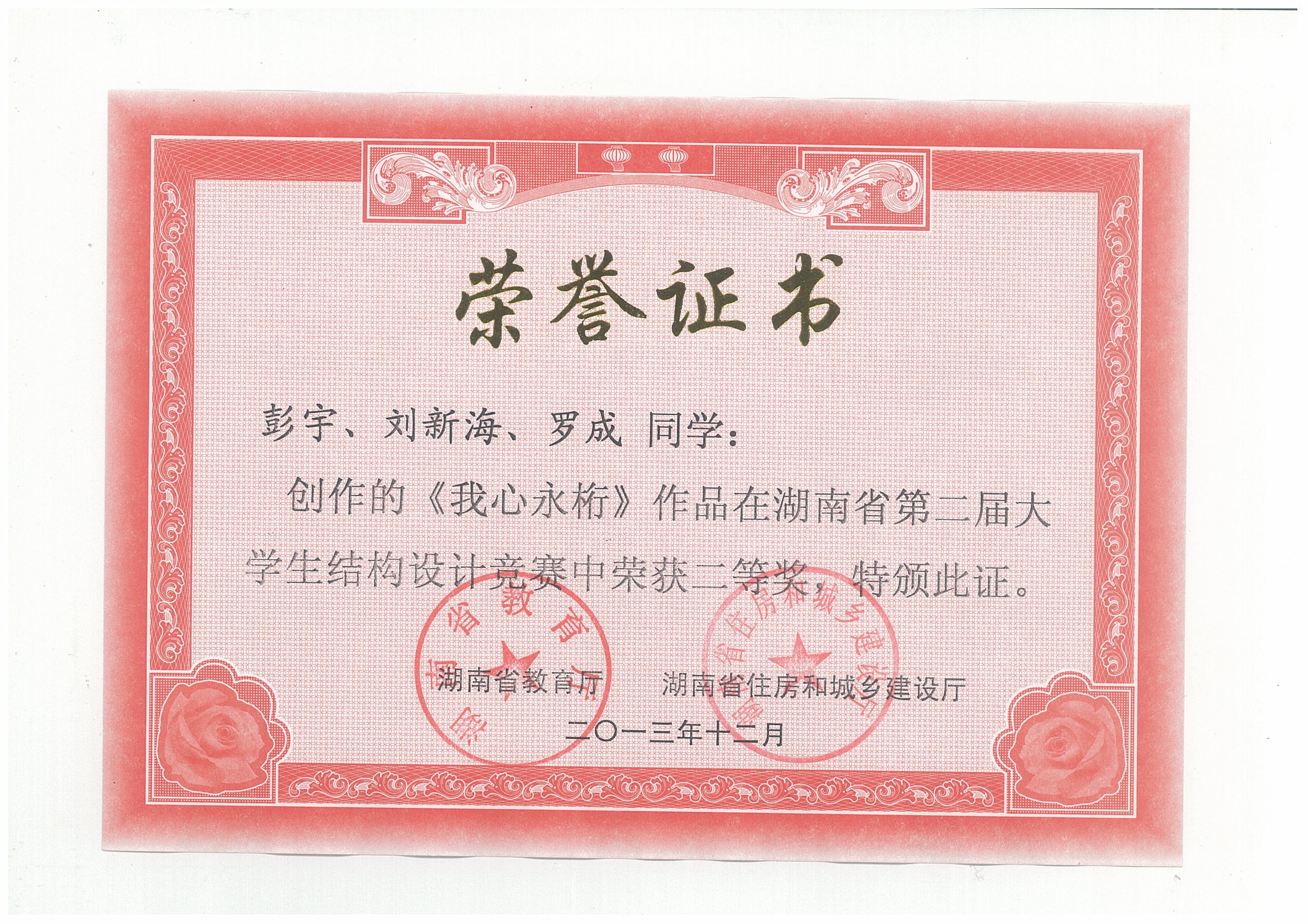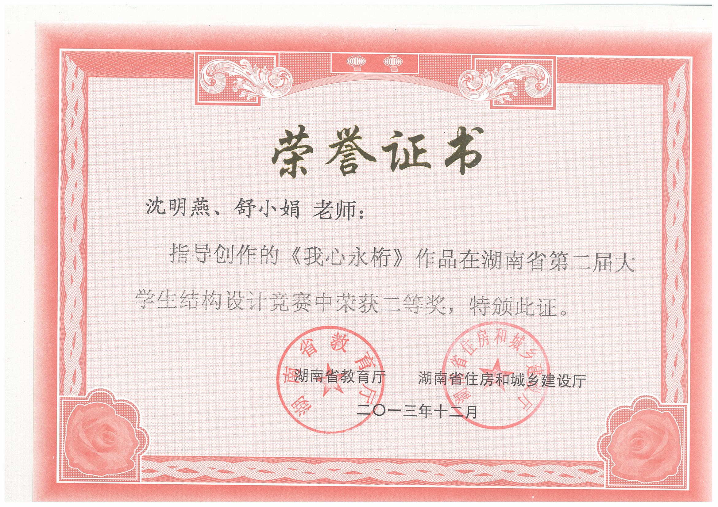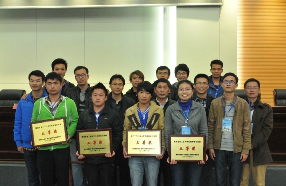 湖南省第二届大学生结构设计竞赛于2013年12月6日至9日在湖南城市学院举行,共56支参赛队伍参加了本届竞赛。36365官网组织和选派了4支队伍参加了本次比赛,最终沈明燕和舒小娟两位老师共同指导的参赛作品“我心永桁”荣获二等奖,黄海林、汪建群、李永贵等三位老师指导的作品也均荣获三等奖,团体总成绩进入本届赛事的全省前四,实现了大学生结构设计竞赛相关建设的飞跃式发展。