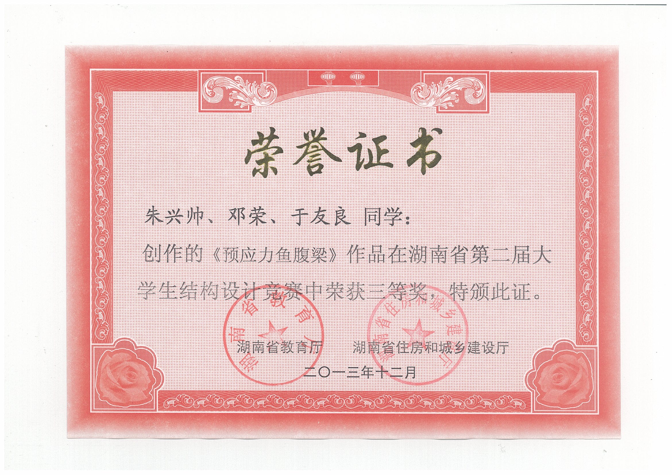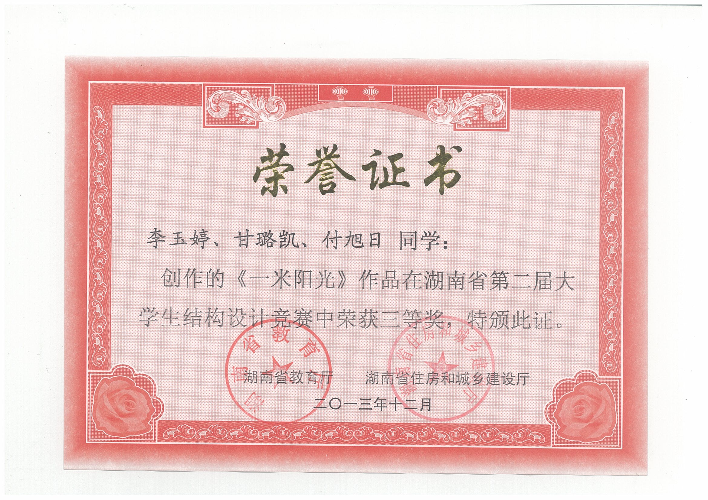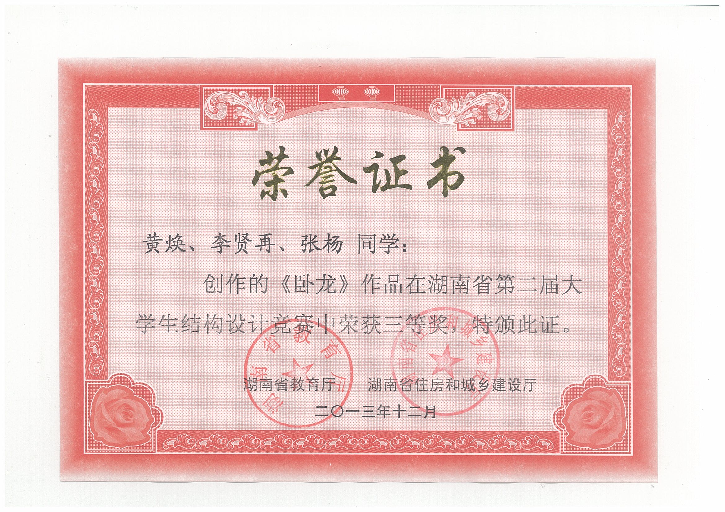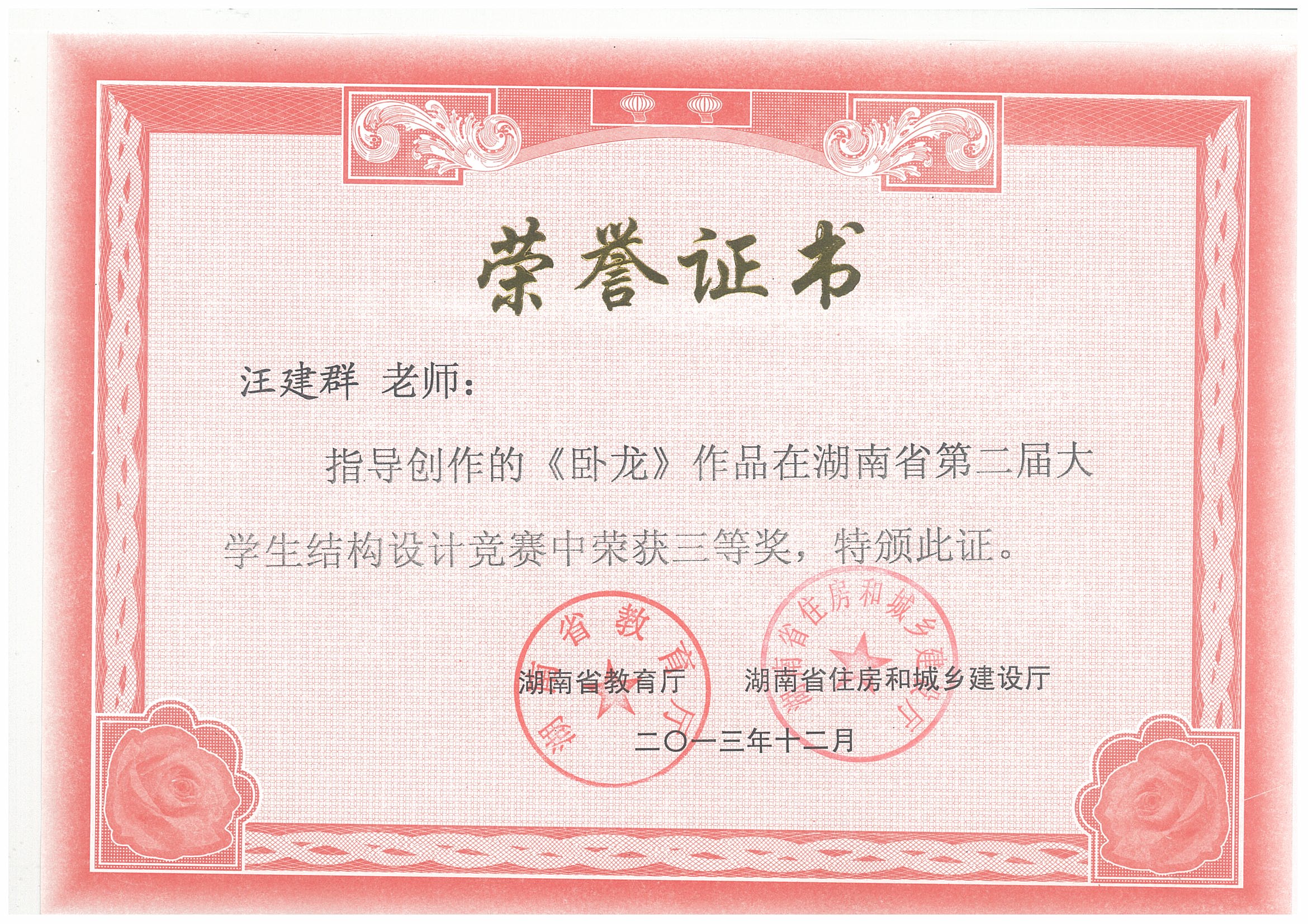 湖南省第二届大学生结构设计竞赛于2013年12月6日至9日在湖南城市学院举行,共56支参赛队伍参加了本届竞赛。36365官网组织和选派了4支队伍参加了本次比赛,最终沈明燕和舒小娟两位老师共同指导的参赛作品“我心永桁”荣获二等奖,黄海林、汪建群、李永贵等三位老师指导的作品也均荣获三等奖,团体总成绩进入本届赛事的全省前四,实现了大学生结构设计竞赛相关建设的飞跃式发展。