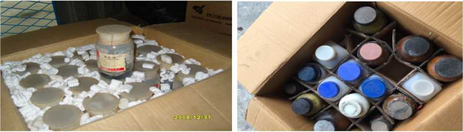 普通化学试剂:按有机液体、有机固体、强酸、强碱、无机盐固体、无机盐液体、强氧化性、强还原性、金属单质等分类装箱(固液分箱、酸碱分箱、有机无机分箱);特殊类试剂(须双重自封袋密封):按活泼金属、易自燃(P)、强反应性(卤素单质、S、电石等)、其他特殊:双氧水、高价酸盐等单独分箱;无标签试剂(须双重自封袋密封):按无标签固体试剂、无标签液体试剂单独分箱;箱内用软质材料填充瓶与瓶间的空隙。侧面贴好危险废物标签。 清点试剂种类和数量后,在包装箱上面张贴已填好的废药品及化学试剂清单。 |