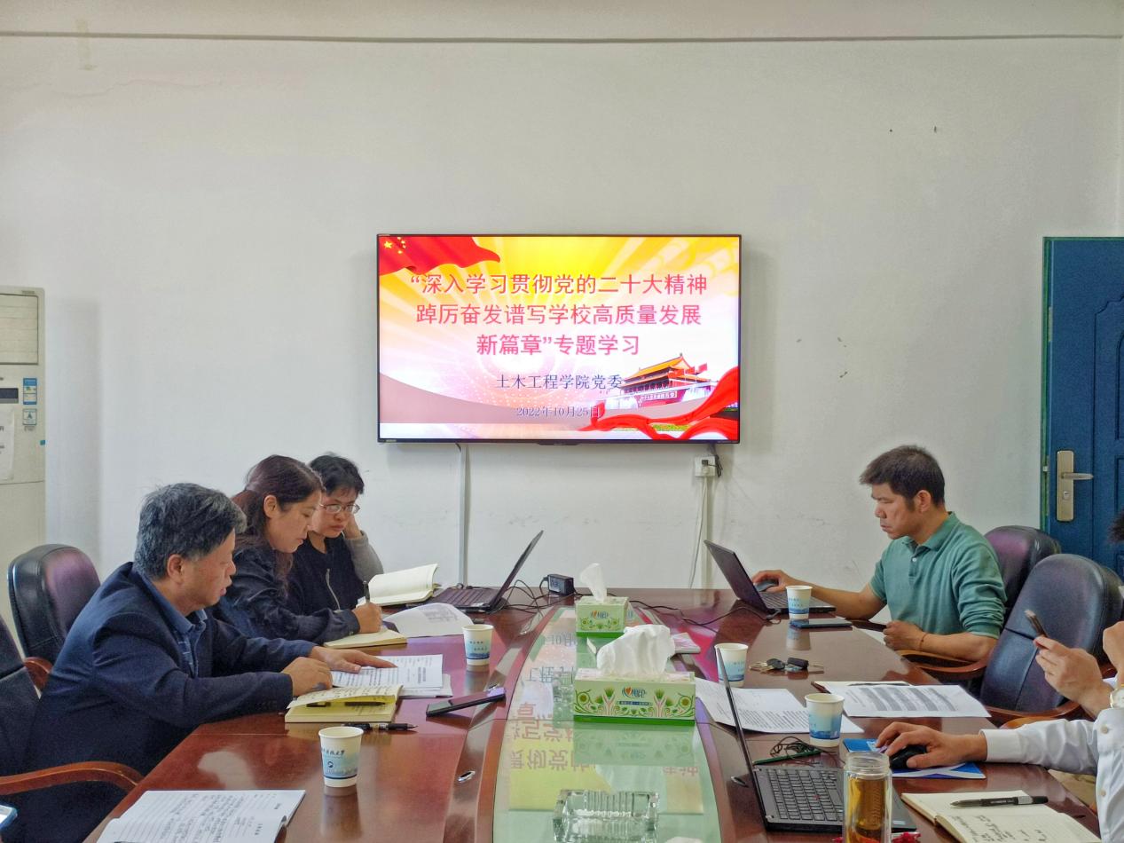 为进一步学习党的二十大精神,全面贯彻习近平新时代中国特色社会主义思想,推动学校工作高质量发展。2022年10月25日上午9:00,36365线路检测登录入口党委于土木楼213A会议室开展了“深入学习贯彻党的二十大精神,踔厉奋发谱写学校高质量发展新篇章”专题学习。36365线路检测登录入口党委书记祝明桥,院长孙洪鑫,院党委副书记王艳及院党委委员、院党政办主任、组织专员参与此会。