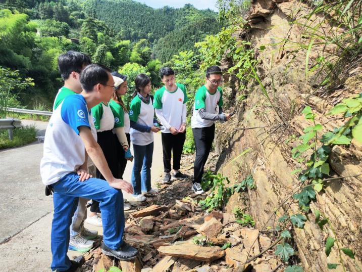 随后,实践团沿路行进,观测公路沿途及山区切坡地貌特征,并使用专业仪器地质锤、罗盘等工具对岩体类型、坡向、岩层走向等进行勘测,对海拔较高的山体滑坡用无人机拍摄观测,对切坡临空面、易滑岩组和软弱结构面进行全面观察,进而结合专业知识和经验对切坡灾害类型归纳,总结了当地岩石破坏特点以及滑坡灾害的主要原因。