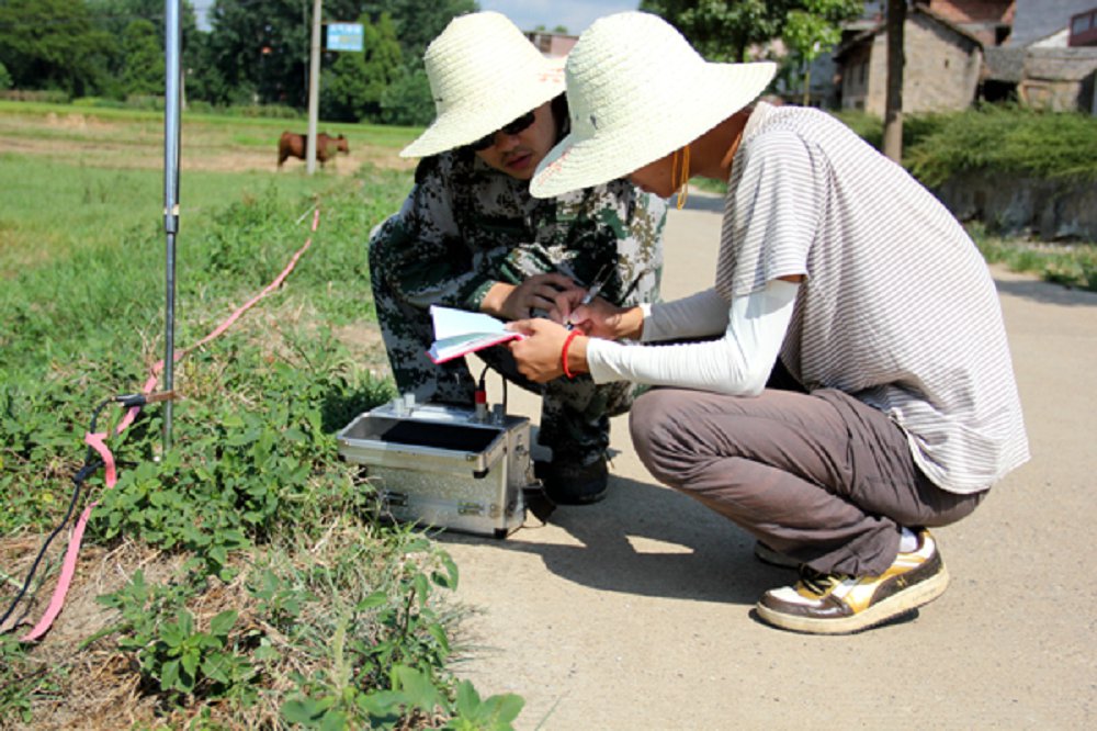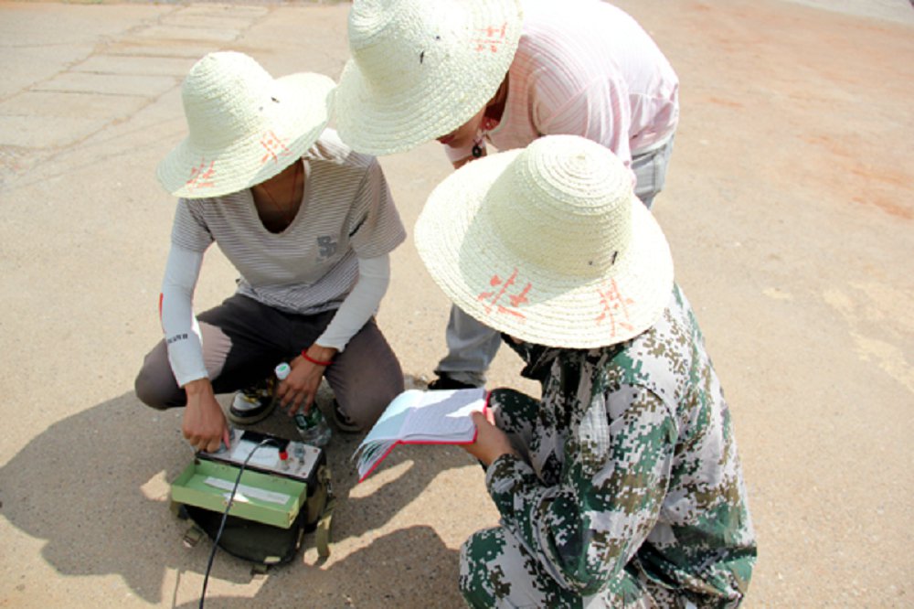 小分队今天的任务也是进行地面物探,使用天然电场选频仪来测量地下数据。 天然电场选频法是根据大地电磁法(MT)理论,由音频大地电磁法(AMT)演化而来。音频大地电磁法是测量交变电磁场所产生的磁分量和电分量,选频法是其中一个分支,它利用音频(20Hz~20kHz)大地电磁场作为工作场源,以地下岩、土的电性差异为基础,通过沿剖面逐点测量不同频率的大地电磁场在地面上产生的电分量变化情况,得出反映地电信息的电性剖面,以达到解决地质问题的目的。小分队分工明确,三个队员分别负责读数、记录和调试仪器。队员们有了昨天实地测量的经验,再加上默契的配合,效率有了明显的提高。上午11点30左右,小分队就圆满完成了比昨天还多的测量任务。