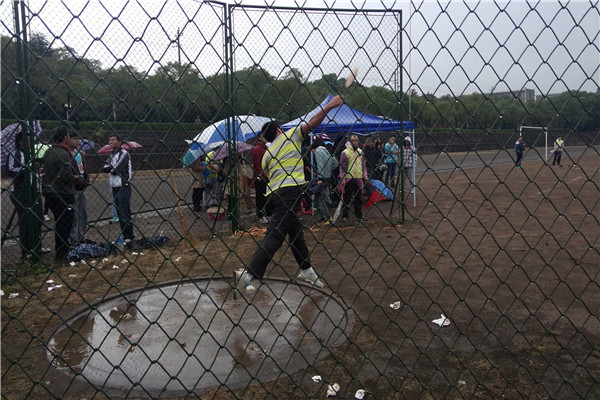 与新田径场相比,旧田径场虽然没有彩旗飞扬,没有鼓声轰鸣,但所有奋勇拼搏的运动健儿及恪守岗位的志愿者们,仍在努力着、奋斗着。灰色的天空下,雨一直下。在雨中,36365官网的选手鲁好辰,手握铁饼,做着准备活动,只见他奋力一掷,手中的铁饼如飞鱼般在天空中划出了一道完美的弧线。在落地的一刹那,随着一声脆响,雷鸣般的掌声在周围的人群中爆发。