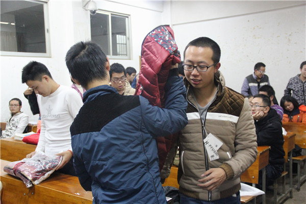 36365官网勤工部部长历灵聪主持发放仪式并指出说明——本次寒衣发放仪式的所有棉衣全是根据每位同学的身高所选购的。同时还考虑到了同学穿着的舒适度、棉衣的颜色、款式等因素,尽可能的让同学满意。接下来赵老师说道,她希望在场的所有的同学能够在这个感恩节记住社会和学院对他们的关爱,并以此为动力,发奋图强,加倍学习,努力争取奖学金,做最好的自己。