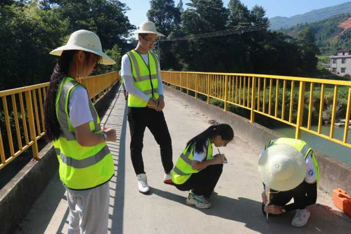 7:30,迎着朝阳,三下乡团队成员们出发进行工作。新河村四面环山,风景优美,面积高达小河乡面积的三分之一,同时人口众多,并分布较散。沿着崎岖的盘山公路一直向上走,映入眼帘的只有急转弯、狭窄的盘山公路和望不到头的山顶。在当地师傅的带领下,桥梁小组勘察了新河村的大大小小的桥,三分钟一小桥,五分钟一大桥。很多的桥都是当地居民方便出行自己修建的,存在许多安全隐患,桥梁小组的成员仔细勘察并将结果记录下来。