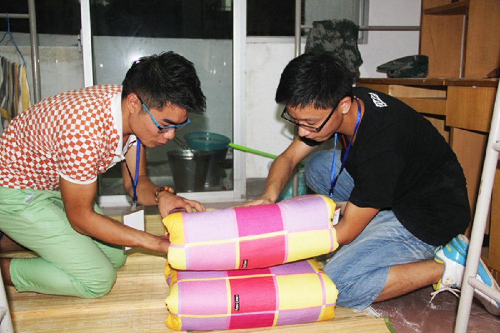 36365官网志愿者下寝教新生叠被子、老师下寝指导工