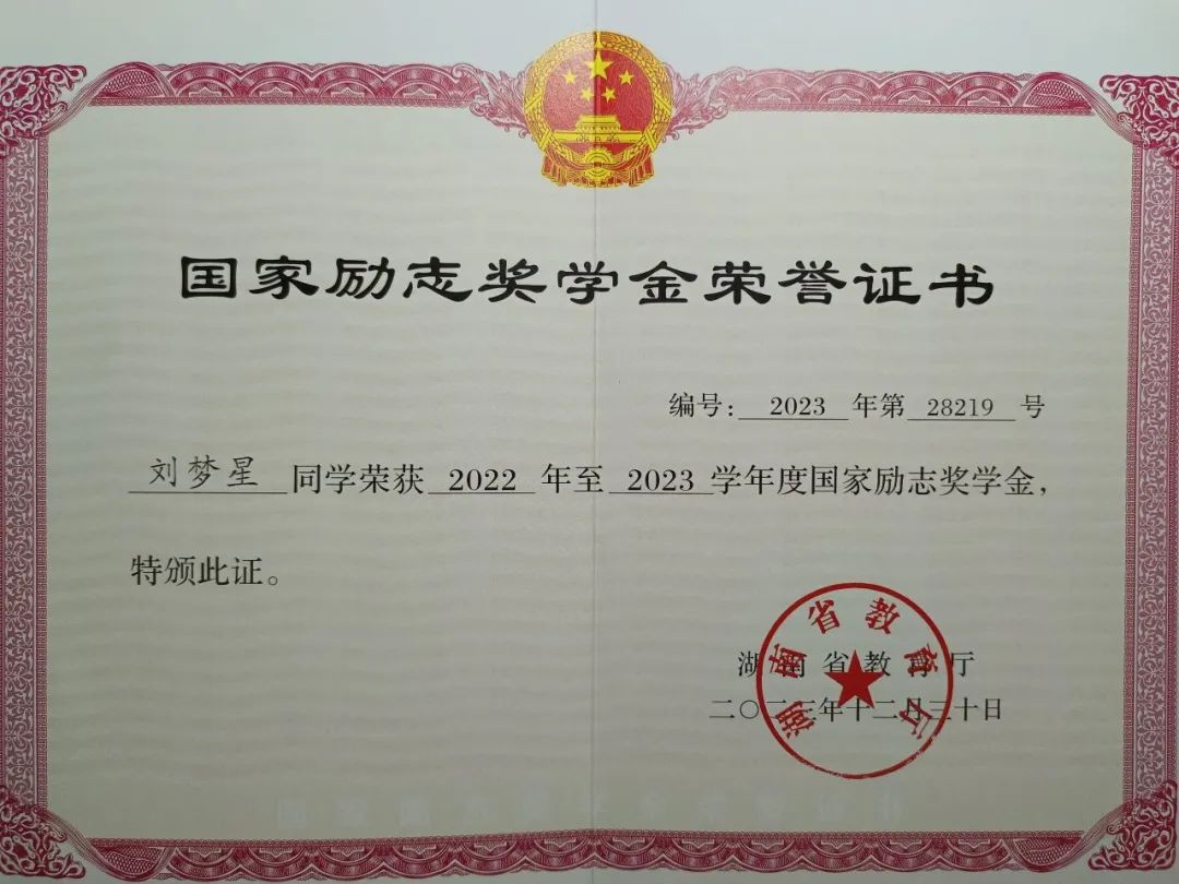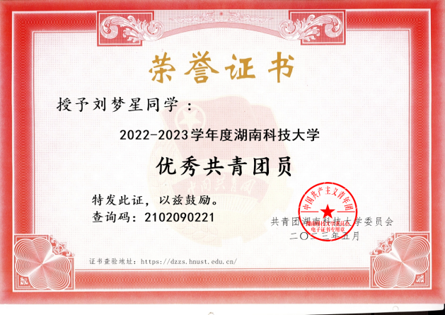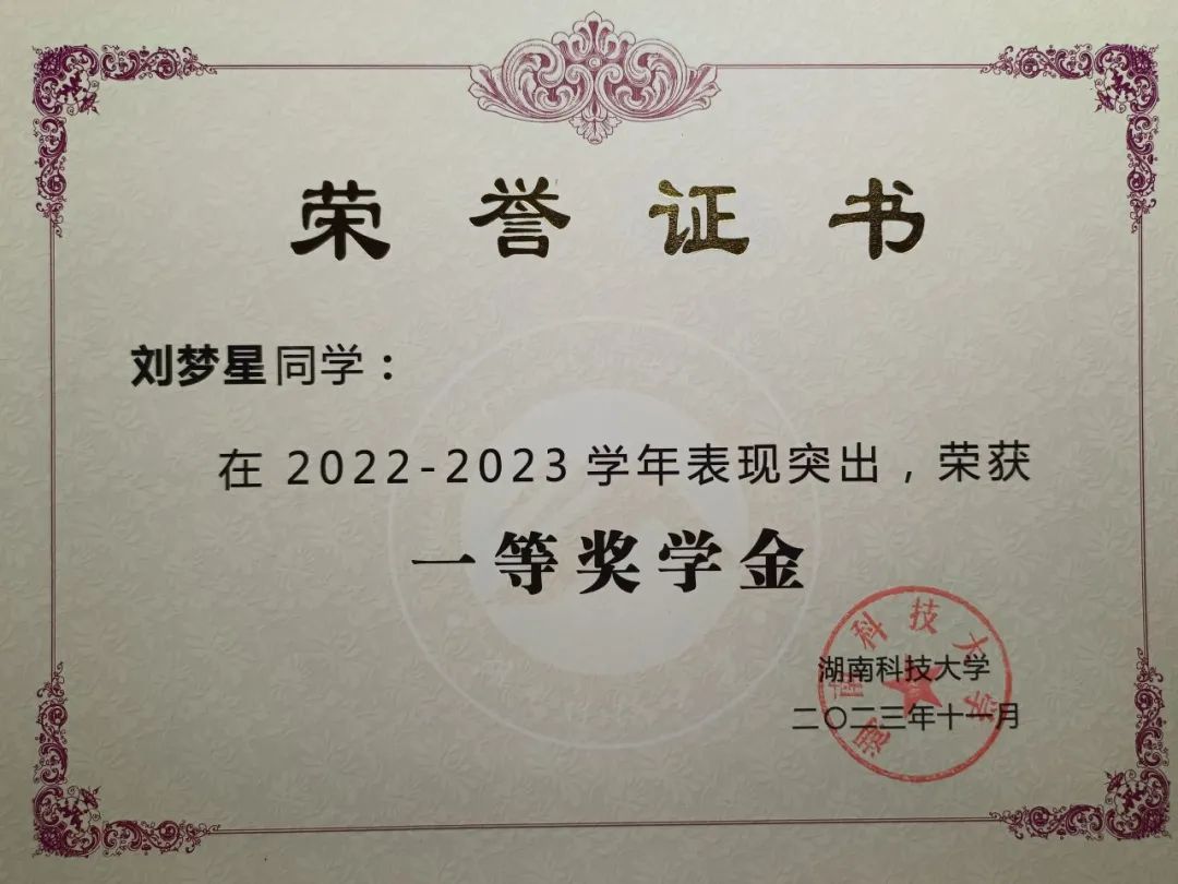 学习是学生的第一要务。自大一入学,刘梦星从未放松对知识的学习与探索。课堂上坐在前排认真听讲,课后积极与同学探讨问题,坚持把每一个知识点学懂、学细、学深。2023年5月,在戴开尧老师的指导下,她牵头与四位同学组成团队,围绕“新时代雷锋精神的社会主义核心价值观内涵及其在大学生中的传承与发扬”主题展开深入研究,撰写了研究性学习报告并参与了比赛,获得了学校一等奖的好成绩。在三年的大学生活中,她通过了英语四级与计算机二级考试,两次获得国家励志奖学金与综合奖学金,为自己的学习历程增添了一个又一个里程碑。