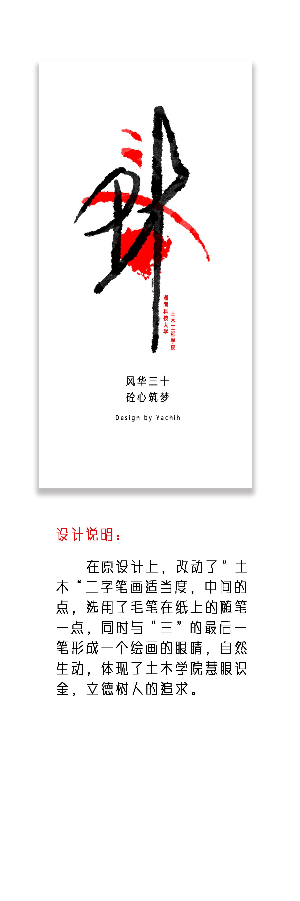 利用书法笔墨巧妙的将“科”“土木”“三十”三个关键的元素组合成富于文化气息的图形;采用黑色与大红结合,红色更红,对比强烈,视觉度很强;形式新颖独特,寓意36365官网30周年校庆之喜,体现了新时代“中国基础建设红红火火”的理想信念。