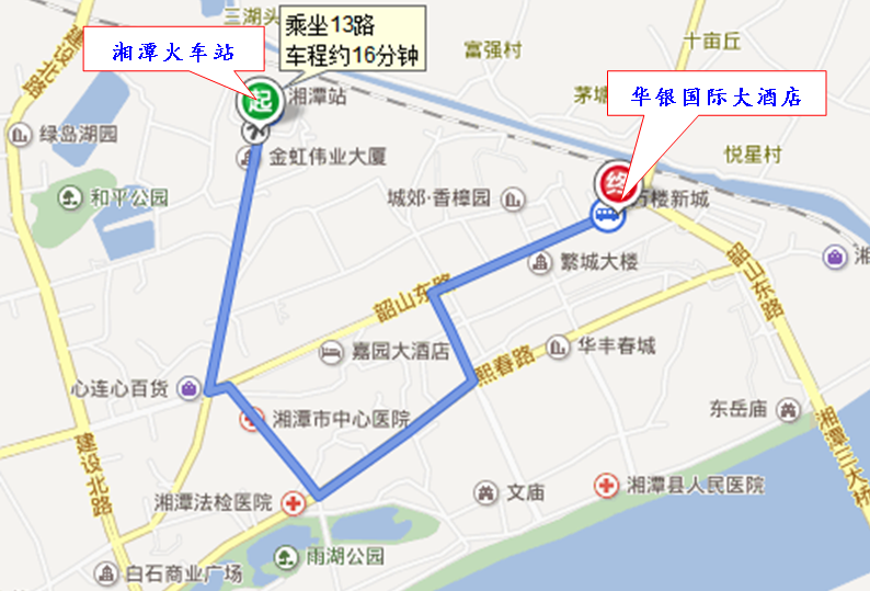 1) 乘出租车:湘潭火车站—湘潭华银国际大酒店(车程用时8分钟,费用约10元);