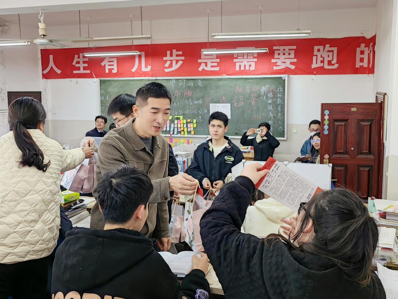 随后,学院领导老师为备考学子分发了精心准备的考研慰问礼包。每一份礼包中都有一份考研慰问信,祝愿每一位备考学子取得优异成绩,前程似锦,慰问信上有学院全体院领导和相关年级老师的签名,设计精美、文字感人,寄托着学院对备考学子们的美好祝福。慰问礼包内还装有满满当当、寓意深刻的食品组合:“橙”功上岸、“苹”平安安、“百事可乐”。