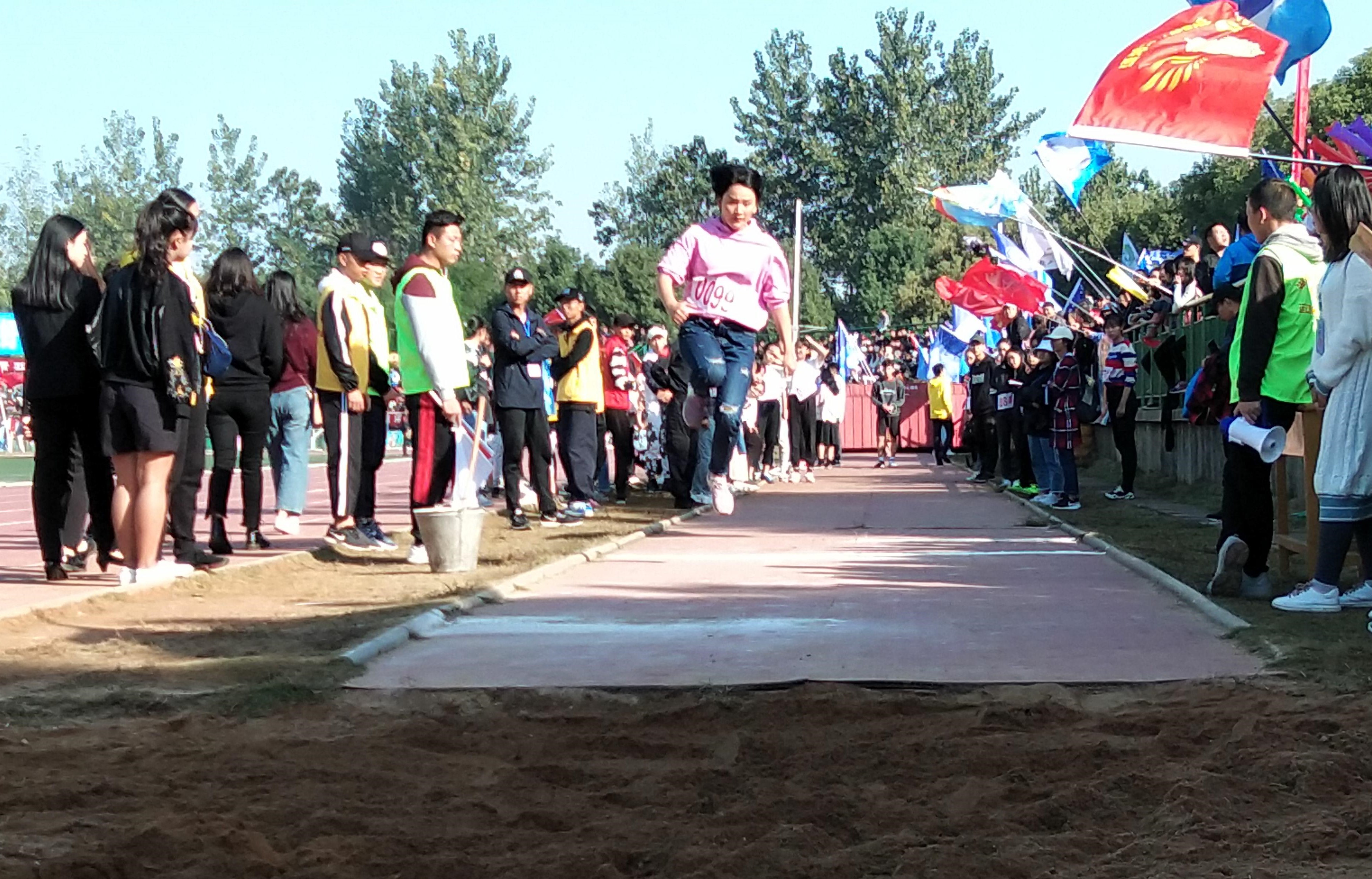 秋日暖阳,缕缕金光落满赛场;锣鼓喧天,声声呐喊贯彻云霄。比赛开始前,郑瑾选手为了克服心目中三级跳最难的部分——步伐的控制和落地时的踩稳,便反复地训练和适应。提膝、弓步,她反复地拉着韧带,以便于寻找到最好的状态去参与比赛。比赛开始了,随着旗帜的落下,郑瑾选手挥动双臂,迈开步子,加快步伐。在到达白线时,她猛然一跳,气势如石破天惊般地向前跃去,落地,再奋力向前跨出一大步,最后在刹那间双腿合并,双臂一挥,竭力向前一跃,落入沙坑之中。瞬间,赛场上爆发出雷鸣般的掌声。比赛结束后,郑瑾选手咧着嘴,带着赛后的轻松和愉悦,在采访时说道:“为了准备这次的三级跳比赛,我不断地加大训练,遇到问题时,向学长学姐请教,来完善自我。通过这次比赛,我明白了奋斗和尽力是对比赛的尊重,同时也是我所信仰的运动精神。”