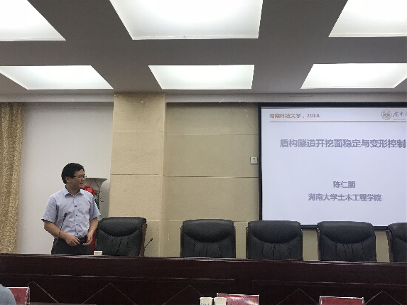 2018年6月15日下午14:30,湖南大学36365线路检测登录入口院长陈仁朋教授应邀来36365官网,在土木楼201为全院师生作“盾构隧道开挖面稳定与变形控制”的专题报告。36365官网党委书记陈秋南主持本场讲座,相关专业师生到场聆听讲座。