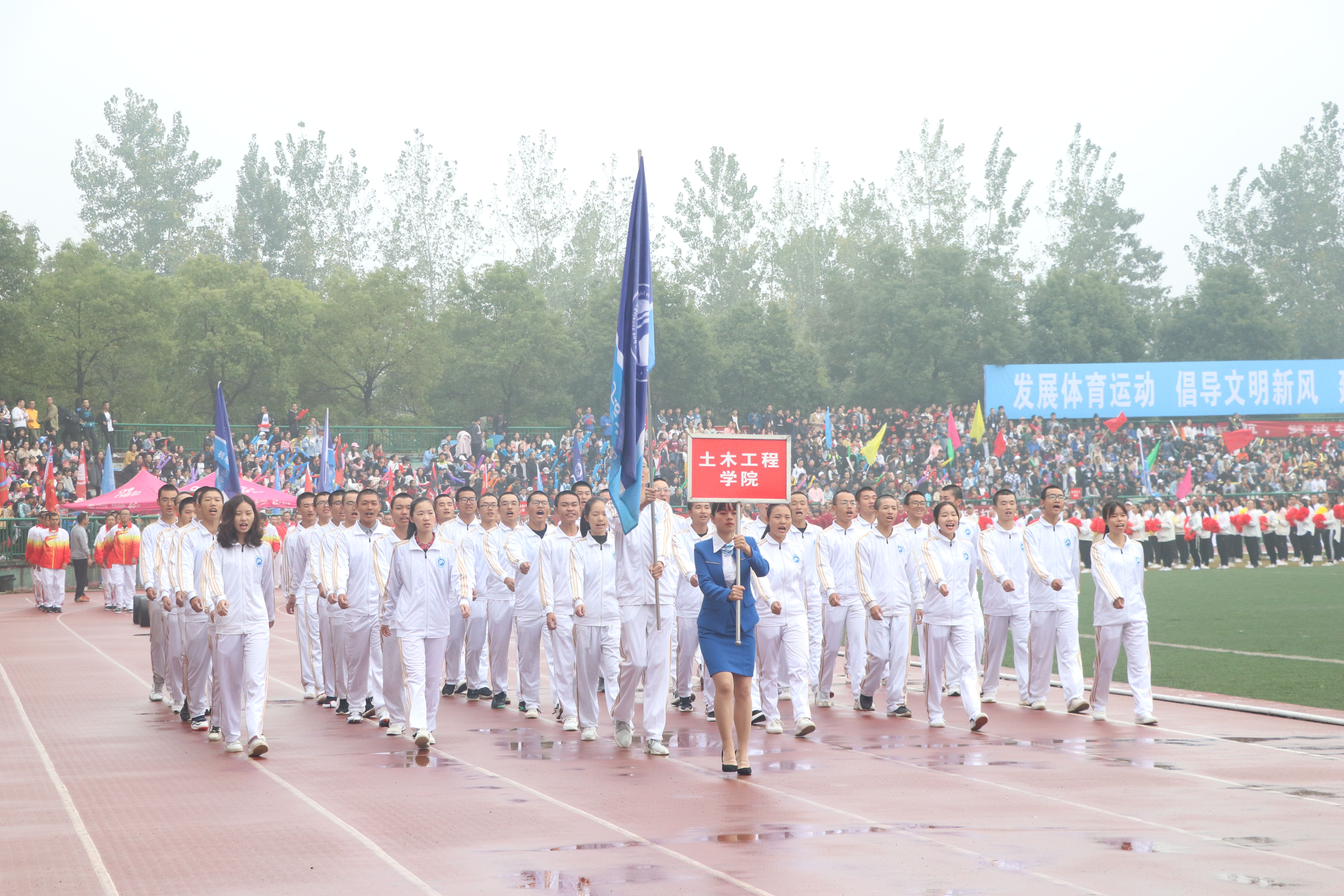 伴随着雄壮的运动员进行曲,校旗队,彩旗队,鲜花队,裁判员代表队,各学院方阵队,教职工代表队依次入场,他们精神抖擞,意气风发,阔步经过主席台接受检阅。高亢嘹亮的口号、鲜艳亮丽的服装、随风舞动的彩旗、飞向空中的气球展示着年轻人的朝气。然后是升国旗仪式,在场人员全体起立,面向冉冉升起的国旗行注目礼。接着,校长李伯超在致辞中对本次运动会的召开表示祝贺,并对在场人员表达了真挚的问候和衷心的感谢。此外,他强调了更快更高更强的体育精神,阐述了我国发展体育运动,完善体育设施的现状。随后,运动员代表、裁判员代表庄严宣誓,体现了顽强拼搏、超越自我、永不言弃的运动精神和公平公正公开的判定原则。至此,此次运动会正式开始。校职工和各学院的精彩表演带动了观众的热情,现场一片沸腾。