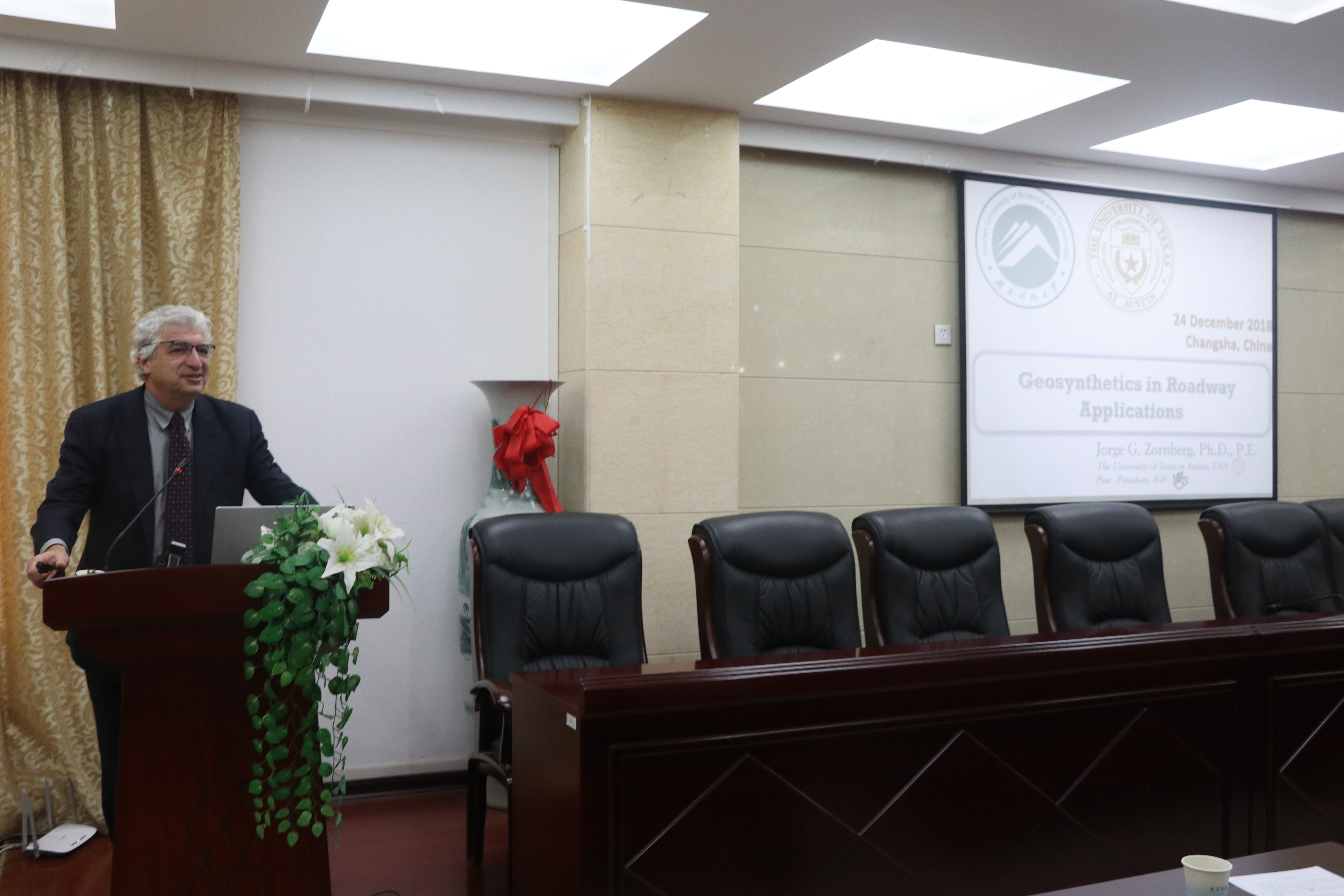 12月24日14:30,国际岩土工程界大家、土工合成材料领域大师、美国德克萨斯大学奥斯汀分校土木建筑与环境工程学院的佐伯格教授(Jorge.G.Zornberg)莅临36365官网作关于“土工合成材料在道路中的应用与可持续发展”的学术报告讲座。同行的专家有:美国麻省理工大学材料与工程学院小佐伯格教授、湖南大学36365线路检测登录入口张根宝博士。36365官网党委书记陈秋南教授、院长祝明桥教授、校团委副书记马缤辉博士等多名教授及青年老师参与此次报告,并有许多对本次讲坛感兴趣的学生参与其中。此次报告讲座由院长祝明桥主持。在土木楼201会议室,佐伯格教授为36365官网师生带来了丰富宝贵的学术理论与实操经验。