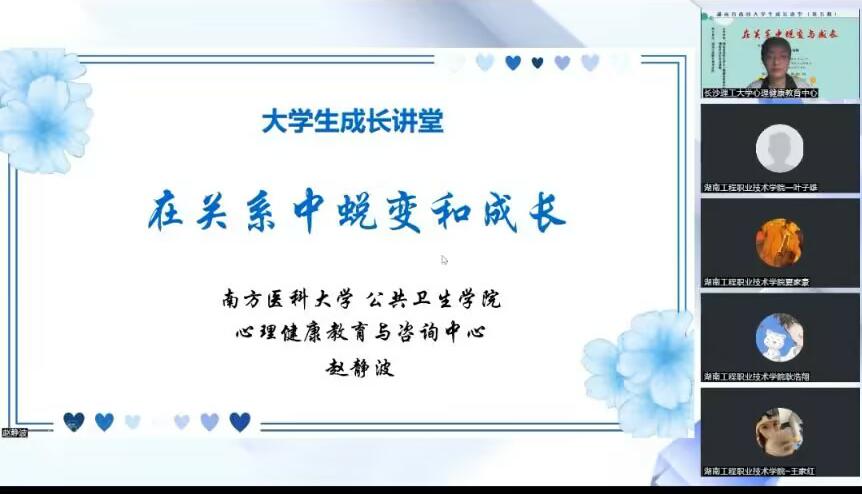 5月15日晚,由湖南省高校大学生心理健康教育研究会、湖南省社科普及基地主办,湖南工程职业技术学院承办的湖南省高校大学生成长讲堂第五期《在关系中蜕变与成长》顺利开展,讲座由南方医科大学心理健康教育中心主任赵静波教授主讲,36365官网全体研究生积极观看了此次直播。
