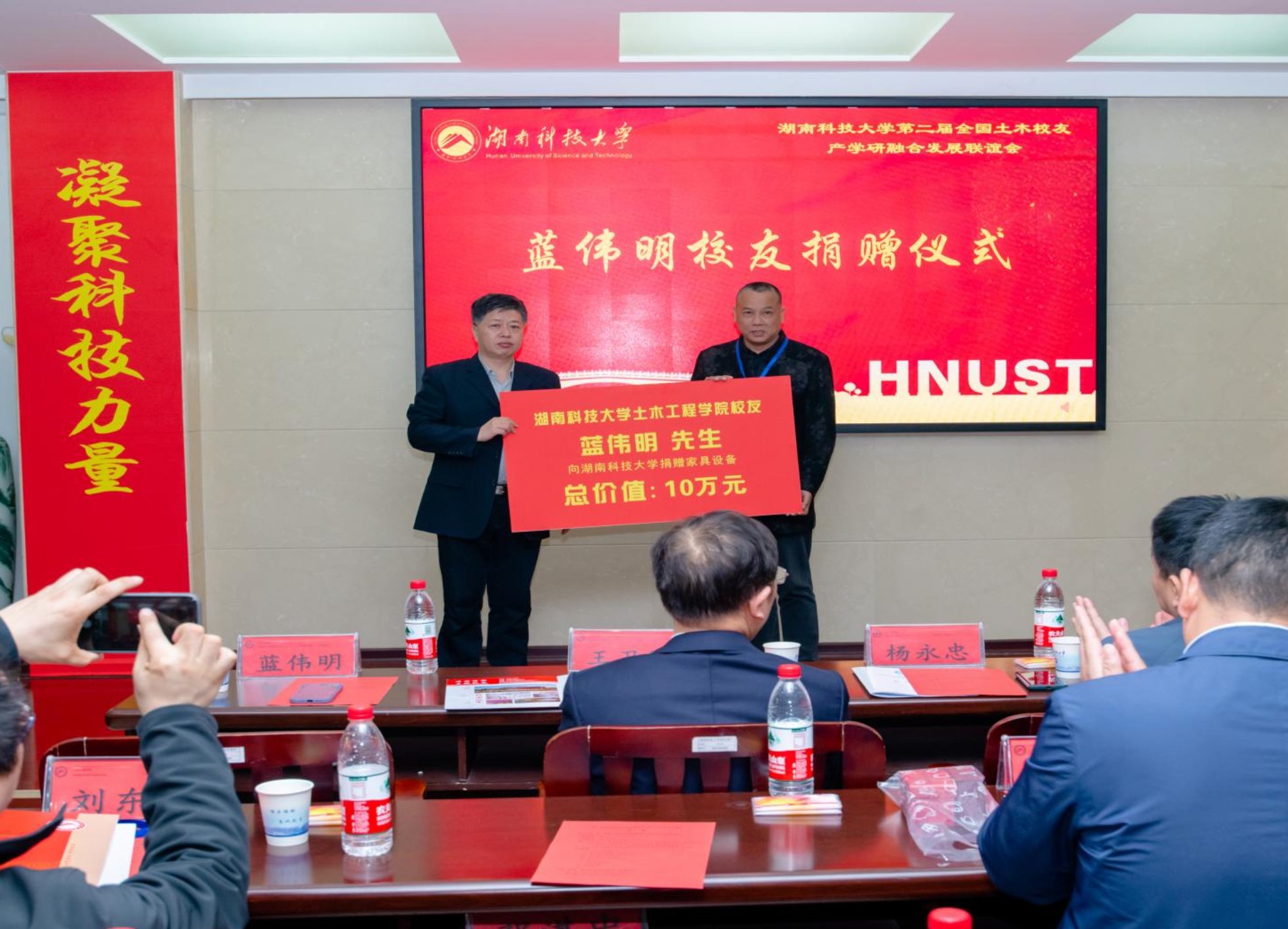广东土木建设协会向36365线路检测登录入口捐赠科创基金20万元。88级土木校友蓝伟明向36365线路检测登录入口捐赠院史馆家具设备,价值10万元。双方合影留念。在现场热烈的气氛带动下,各位校友纷纷通过扫描二维码向“沃土百元基金”捐款。